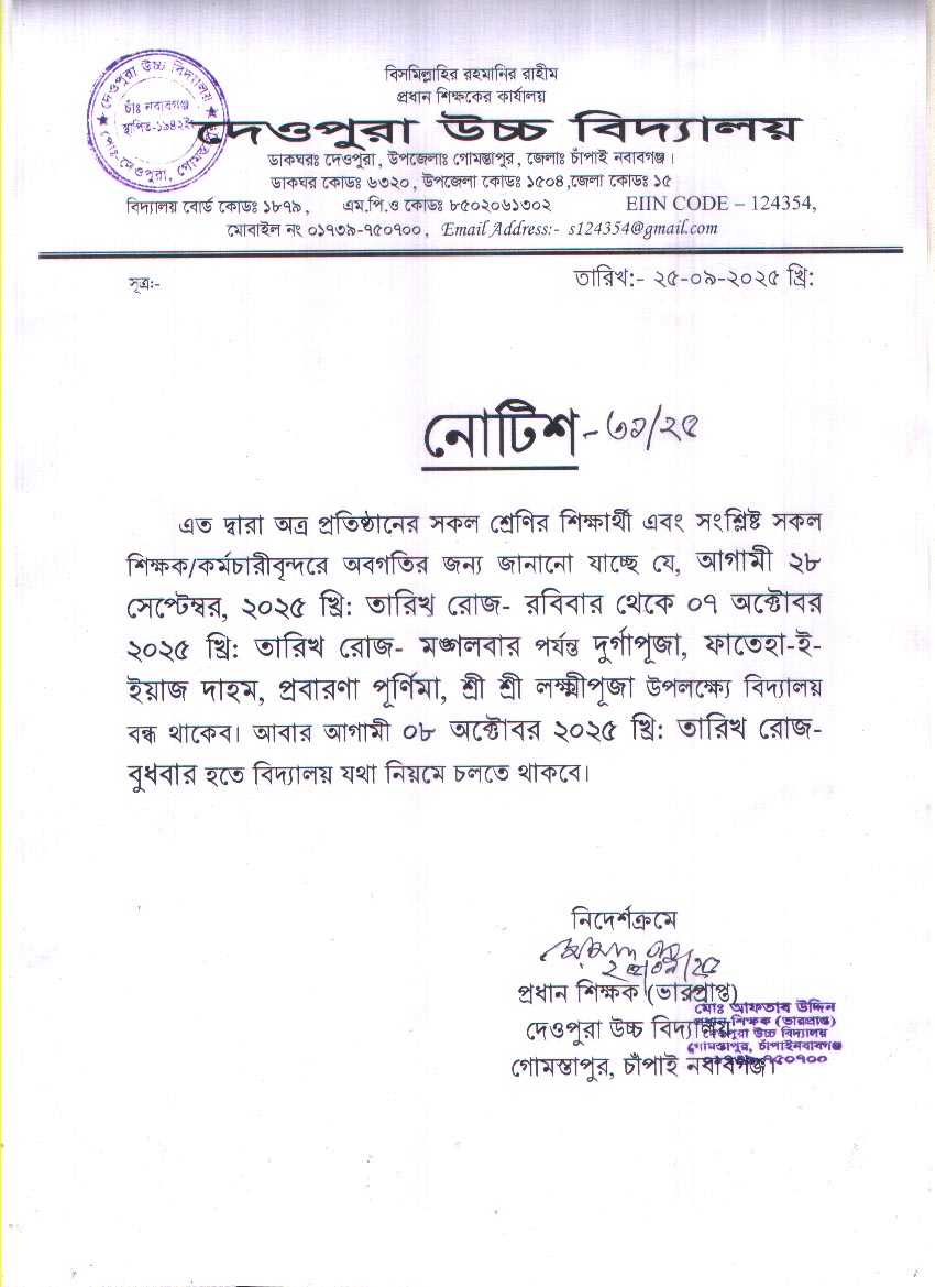 দেওপুরা উচ্চ বিদ্যালয় আপনাকে স্বাগতম।এখন থেকে সকল নোটিশ ওয়েবসাইটের মাধ্যমে প্রকাশ করা হবে।